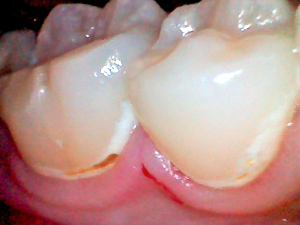 (図1)の写真は奥歯の外側を示し、歯頚部(歯と歯茎のキワ)に帯状のプラークが付着しています。